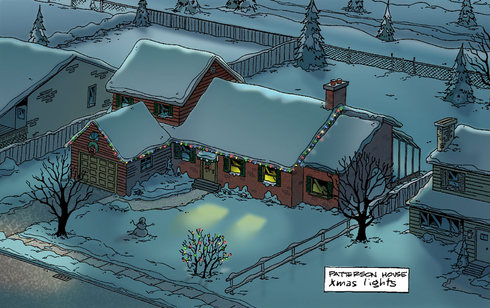 By the time the strip was published, however, we were living in Northern Manitoba in a completely different house with a very different layout. I casually began to copy the interior layout of our new house as I drew the day-to-day lives of the Pattersons—never thinking I would have to pay real attention to the architecture. When the animated shows began to take shape in the early 2000s, we had to do serious schematic drawings of the house, the school, and even the neighbourhood! These were necessary for the animators to turn 2D drawings into a 3D animated world.