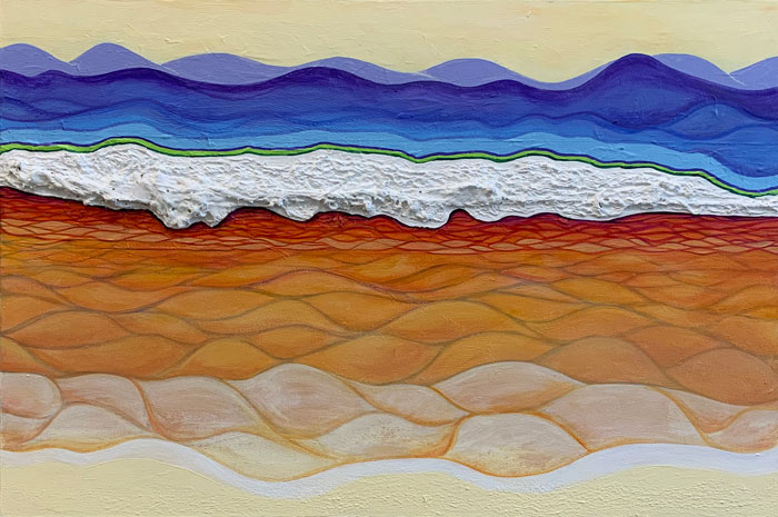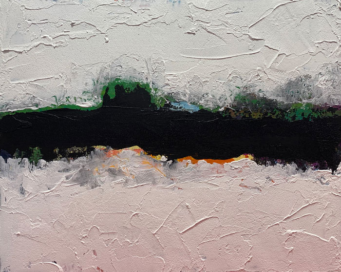 Two of the abstracts are oil and cold wax. The one that looks like a desert with mountains in the background is acrylic. To begin this one, I used gesso and mop cotton, which I pulled like wet spaghetti across the canvas. This was to keep me from making a cartoon landscape; I wanted to do an abstract. Unfortunately, acrylics are what I'm used to, so this painting went from abstract to this desert-looking scene because I overworked it. I played around with it too much. Oil and cold wax is like working with creamy icing, which you spread onto a hard surface using palette knives or squeegees. This is a real change for me. I think it has forced me to work in an abstract style because it takes a while for the surface to dry, and I can't use small brushes. Over the course of the pandemic, painting has kept me busy, happy and sane!