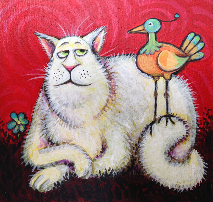 Just before we left North Bay, Ontario, I saw a sale on tiny canvases at a local art/craft shop and thought I'd take advantage. You never know when you'll need a 4X4" canvas, so I bought a bunch of them—I have friends who use them to try out new materials. I thought I'd putter about with cartoon animals in COLOUR, for a change, and these looked like a perfect size. What you'll see here are some fast experiments; some are on wood, others on canvas, and all are done with acrylic paint.