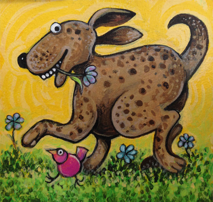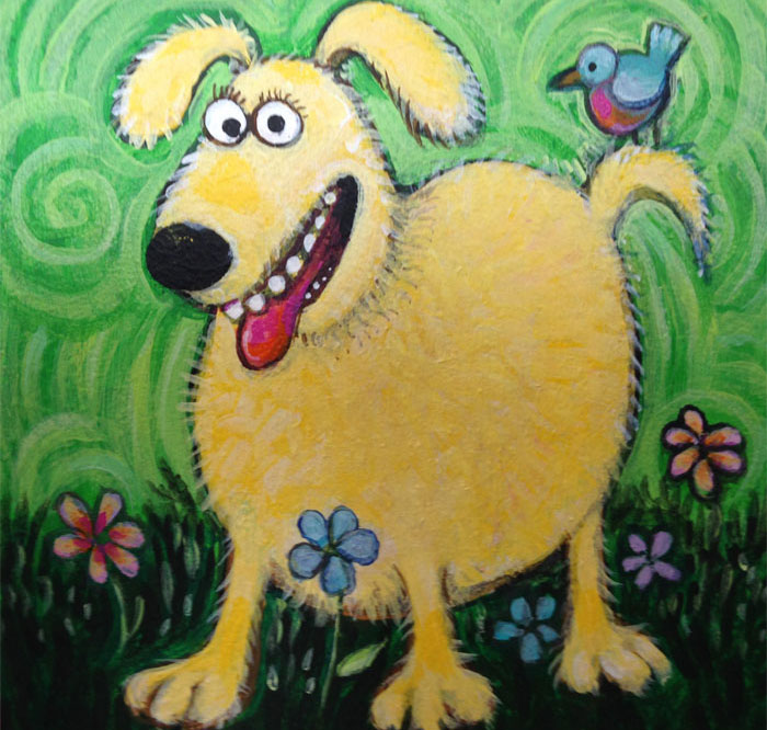 This goofy dog with the flower in his (or her) mouth was done for my granddaughter's bedroom wall. She likes it, which means a lot to me. I did a funny cat for my grandson which he has on his bathroom wall. Someday, when he wants one...I'll do a big painting for him as well.