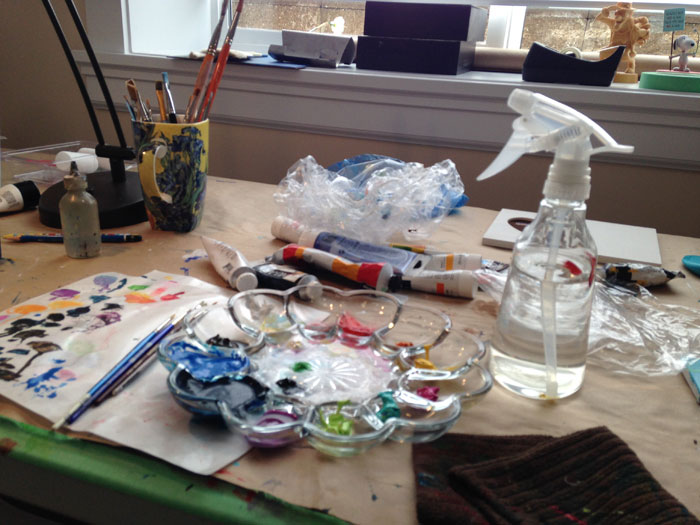 I like to use glass egg trays when I paint. The colours are kept separate. I can mix on the centre of the glass or on disposable paper mixing sheets. I use a laundry sprayer to keep the paint moist as I use it, then I cover the tray with light, plastic shower caps so nothing dries out for the next day's work. These can be found at your dollar store.