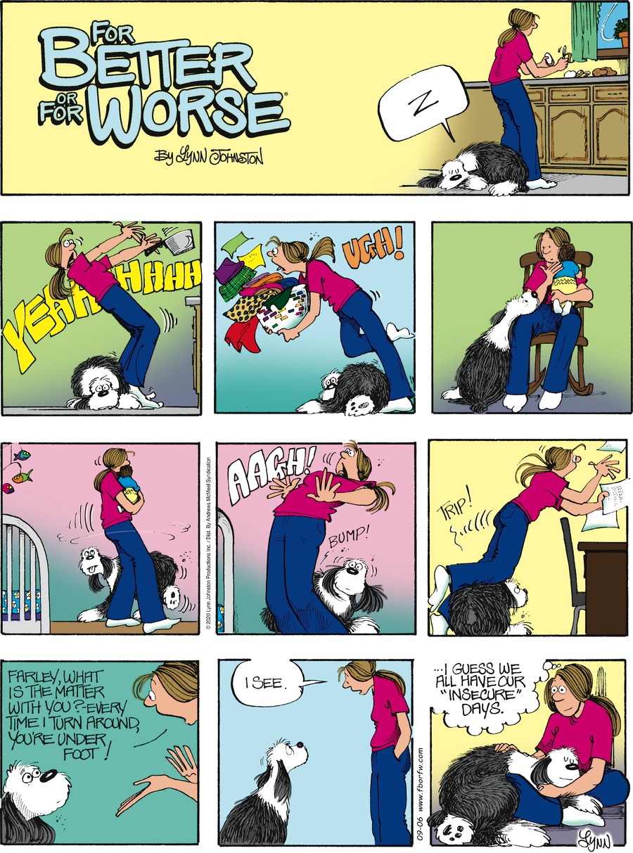 Lynn's Comments: This was so much fun to draw. When I look at this strip again, I remember drawing it in pencil and looking forward to tracing it with pen and ink. Feeling the bite of pen nib on paper and seeing the lines become the characters was like "bringing them to life." April (as a baby) and the dogs were an absolute joy to work on.
