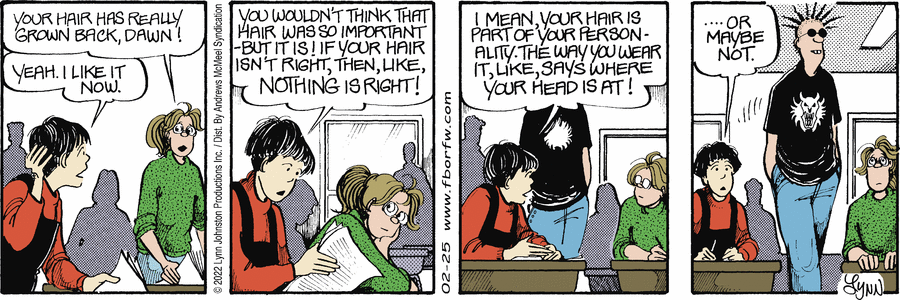 Lynn's Comments: Here I drew a young man I had seen on the street. His hair was multicoloured and standing like a fan—straight up and rigid. I figured that you don't go out in public like this unless you want attention, so I asked him how he had done his hair. His answer was, "wood glue and bingo dabbers." What fun!