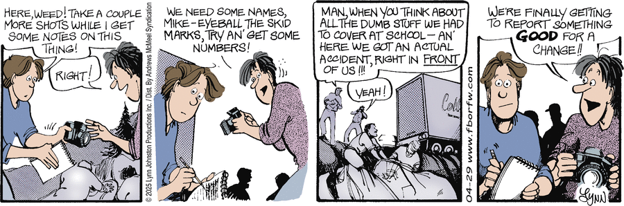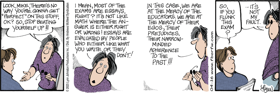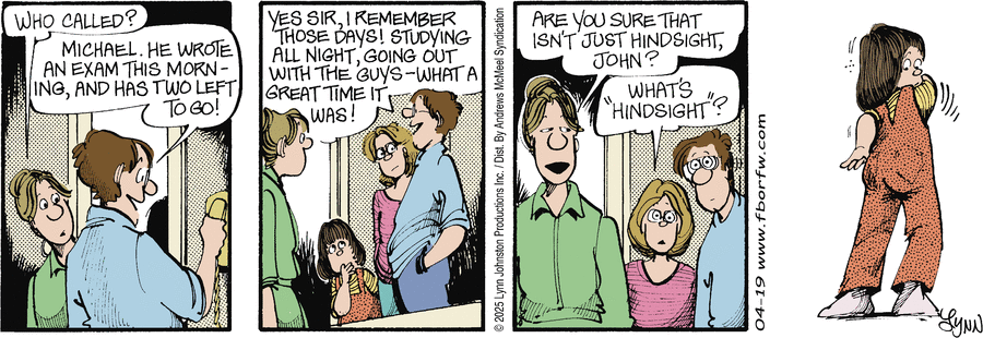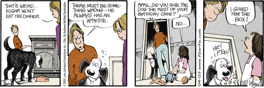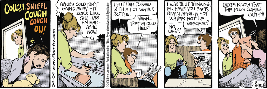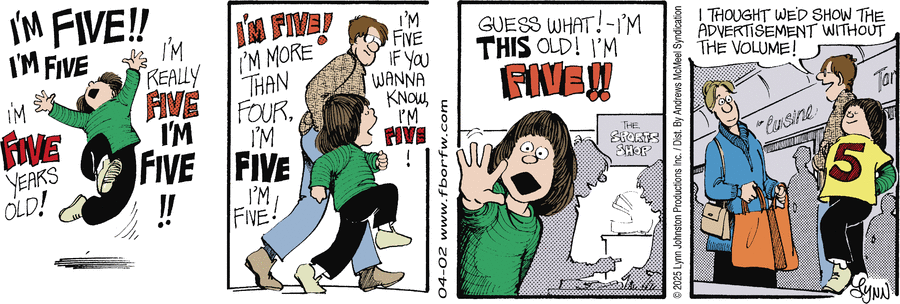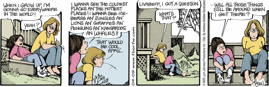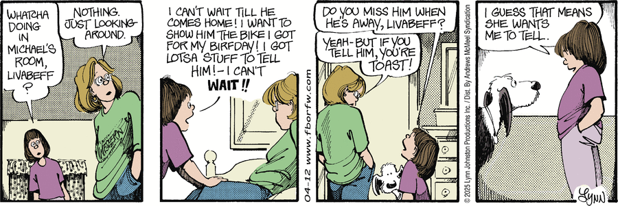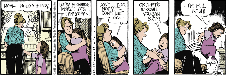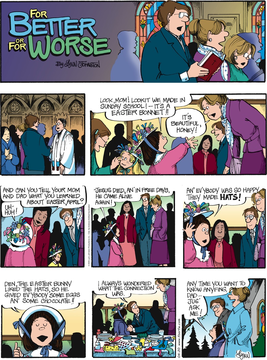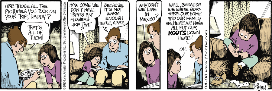 Lynn's Comments: Readers criticized April’s “kidspeak” and told me to make her use proper English. I thought it would detract from a child’s charming way of learning the language. As long as my editors were OK with the content of the strip, I left it alone. One can suffer from too much advice!