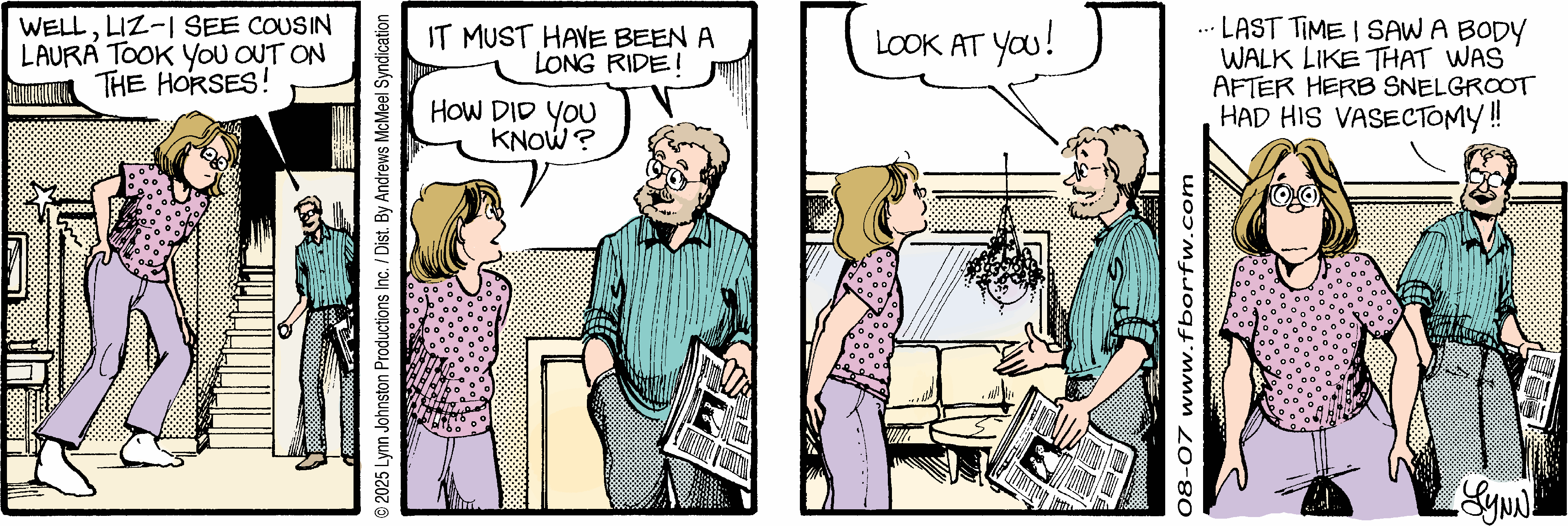 Lynn's Comments: A friend of ours was walking down the street with a painful, bow-legged gait. He passed one of his students who said, “Mr. Benson, I know what you were doing!” He blushed. She continued, “You were riding a horse!” He was relieved…he had just had a vasectomy.