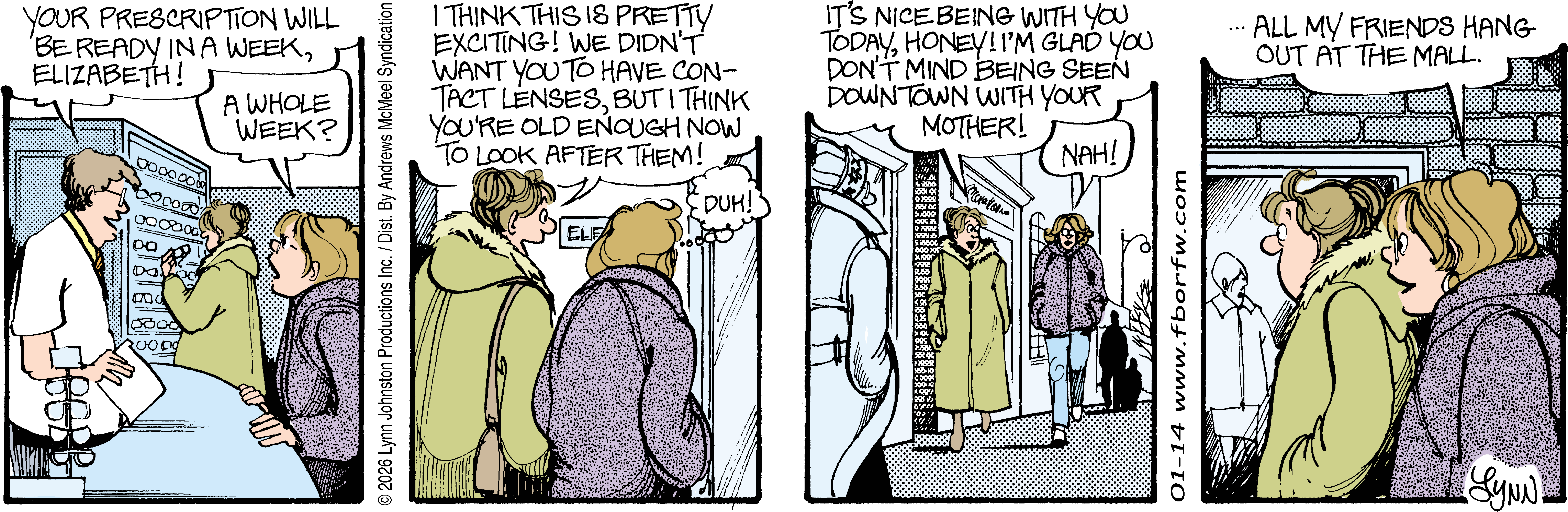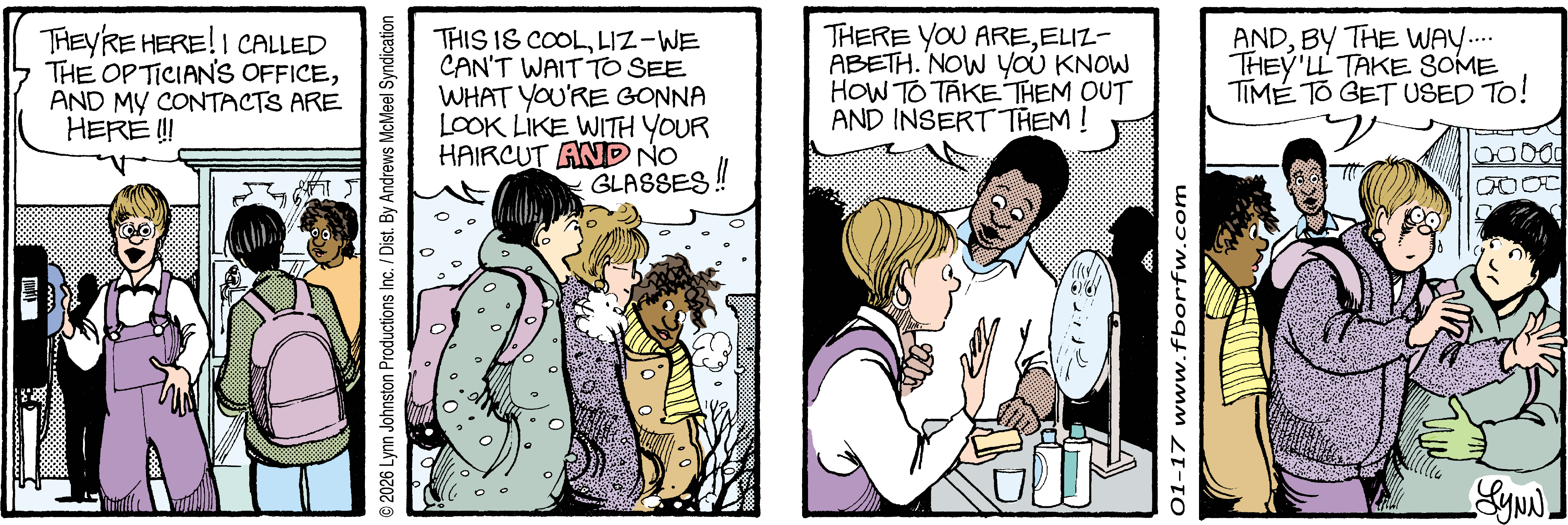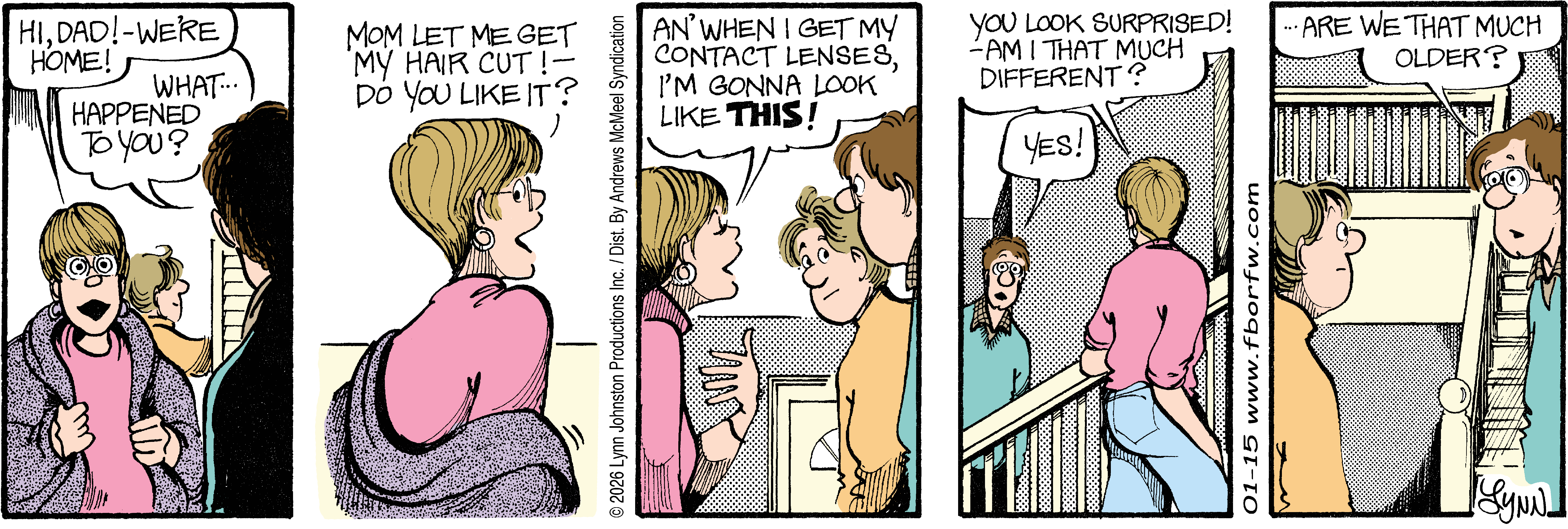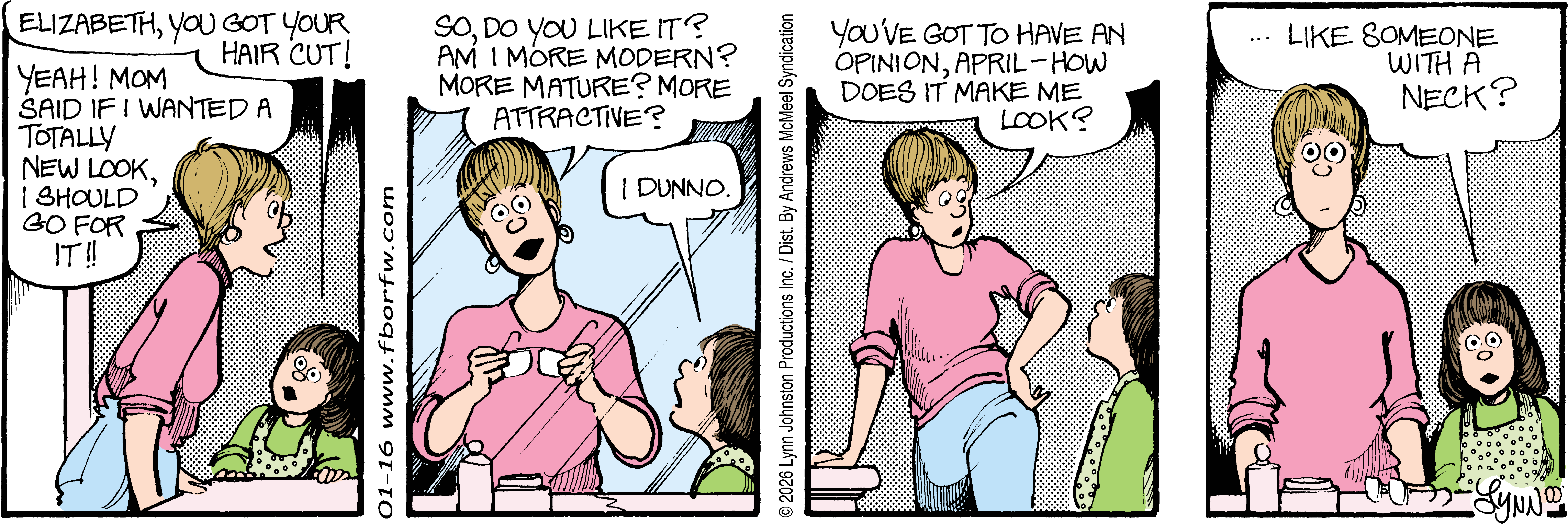 Lynn's Comments: Changing a character’s hair was always a big deal. I figured it wouldn’t make sense for teenagers to not go through some experimentation, so both Elizabeth and Michael had some different “looks” throughout the latter part of the strip. Elly and John, however, stayed pretty much the same.