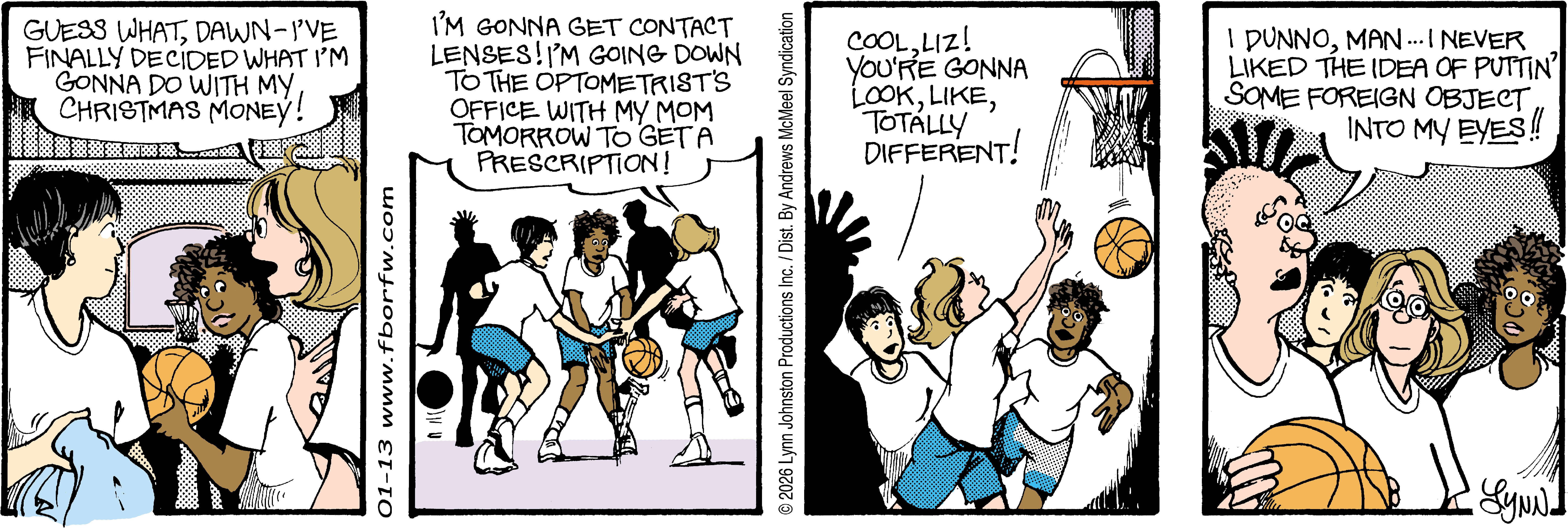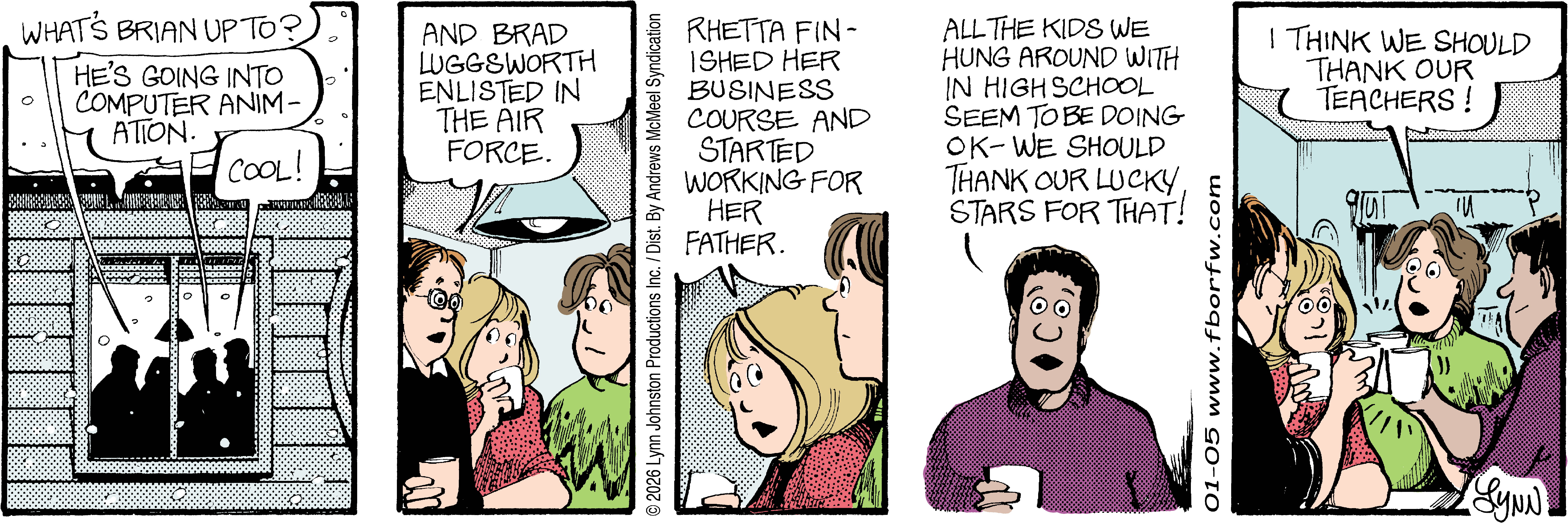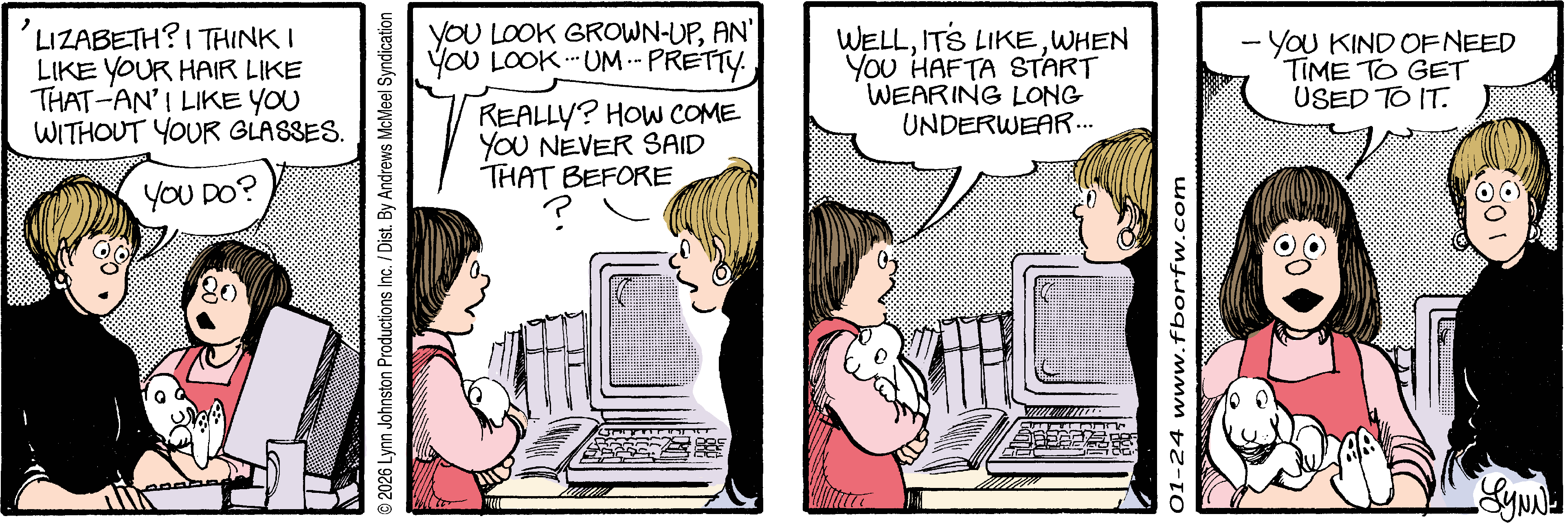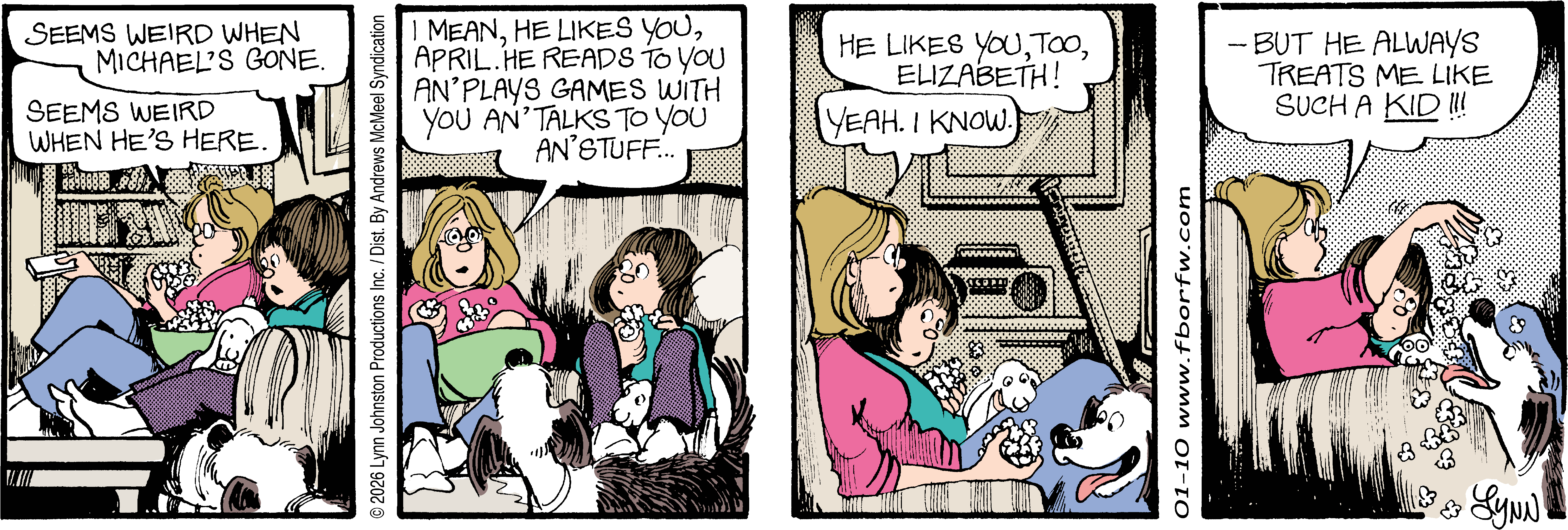 Lynn's Comments: Changing a character’s hair was always a big deal. I figured it wouldn’t make sense for teenagers to not go through some experimentation, so both Elizabeth and Michael had some different “looks” throughout the latter part of the strip. Elly and John, however, stayed pretty much the same.