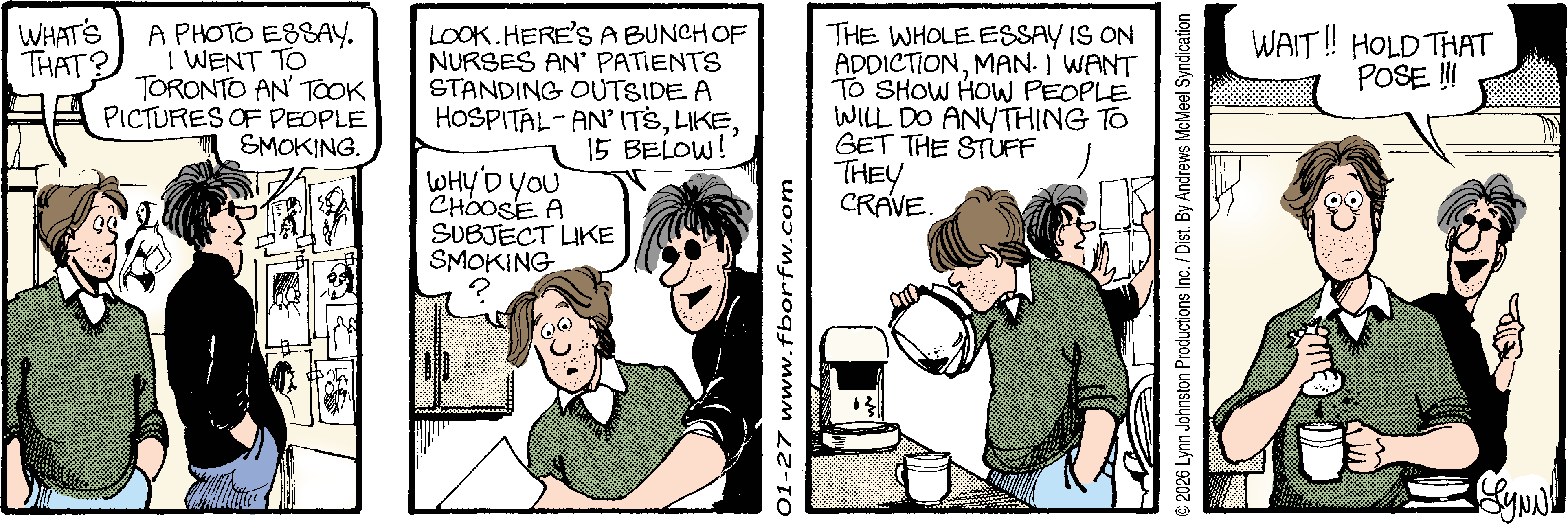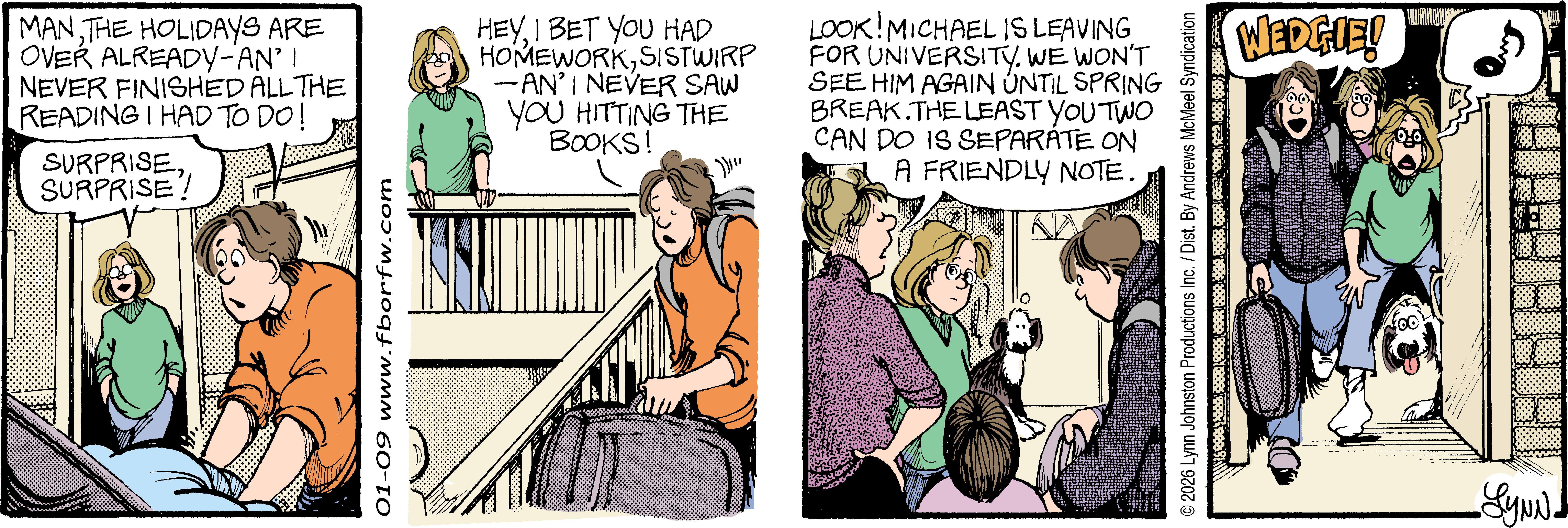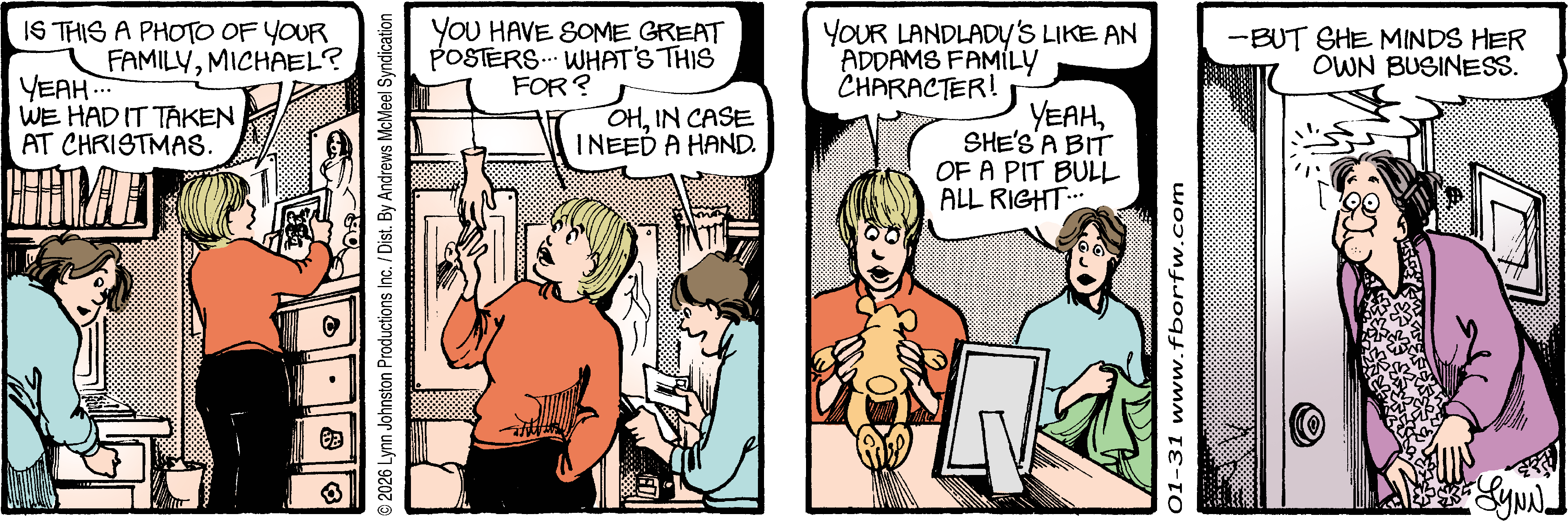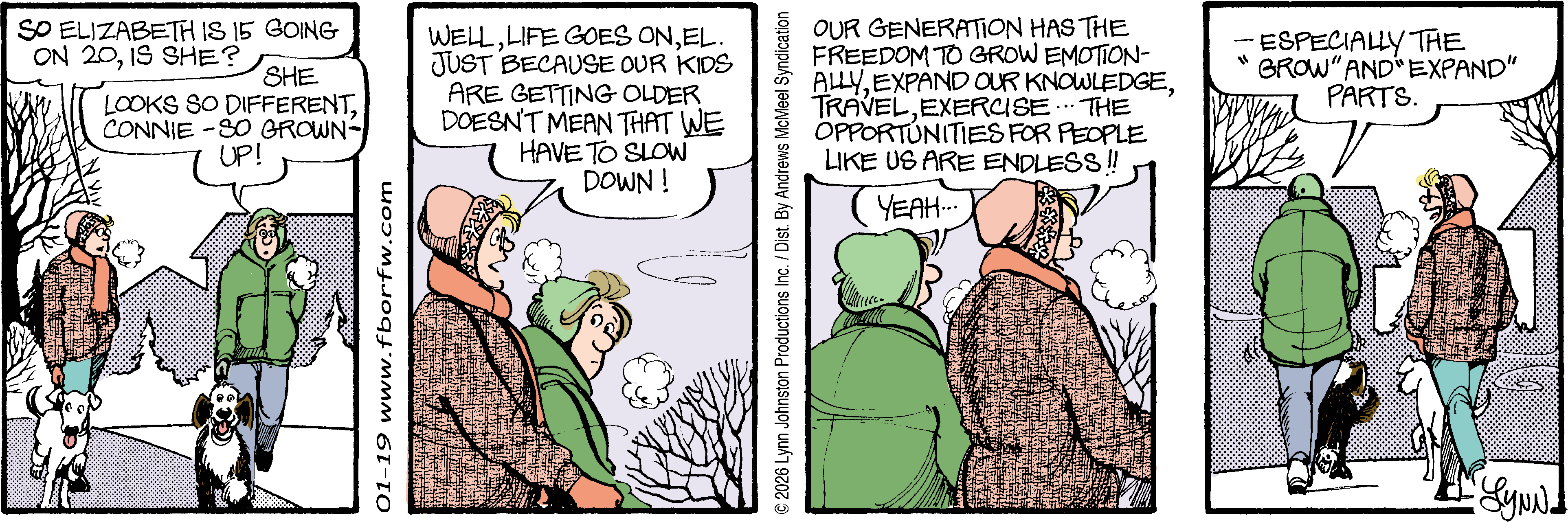 Lynn's Comments: Changing a character’s hair was always a big deal. I figured it wouldn’t make sense for teenagers to not go through some experimentation, so both Elizabeth and Michael had some different “looks” throughout the latter part of the strip. Elly and John, however, stayed pretty much the same.