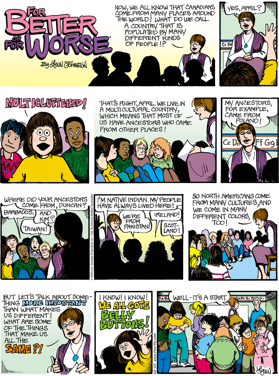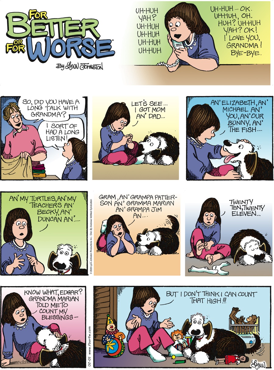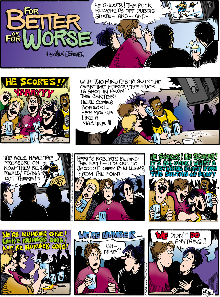 Lynn's Comments: This idea came from a lunch I had with Peanuts creator, Charles Schulz. We were in a busy pub. There was a hockey game on the big screen television, and when someone shot the winning goal, the bar erupted in, “We’re number one! We’re number one!” Sparky turned to me and said, rather dryly, “I don’t understand. How can these people say they’re number one when all they did was sit here? They did nothing!”
